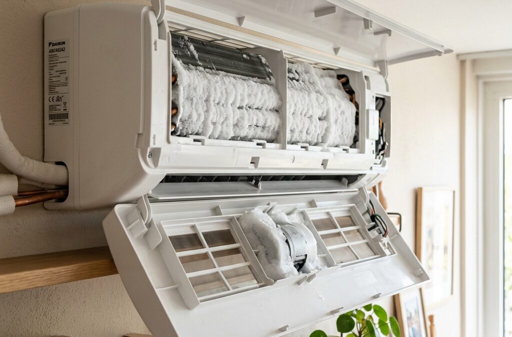 Abres la tapa de tu aire acondicionado porque notas que no sopla aire frío, y te llevas un susto tremendo: el interior del aparato está completamente cubierto por un bloque de hielo blanco y macizo.